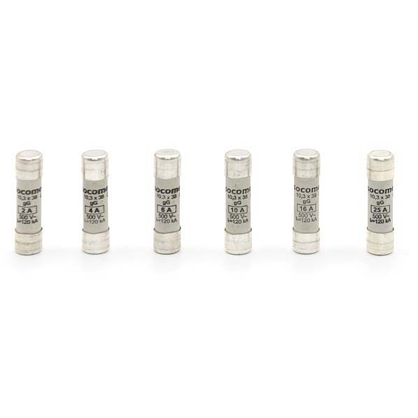 Cъемные трубчатые предохранители gG 10x38: размер 10х38 мм; допустимый ток нагрузки - 6 А; номинальное напряжение 500 В.